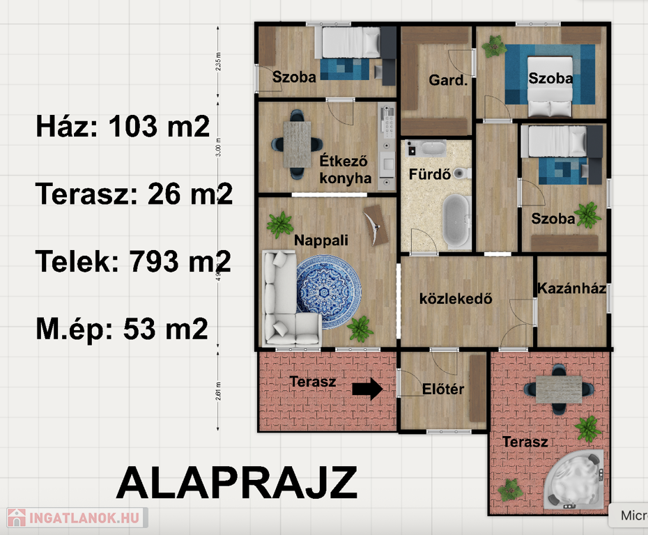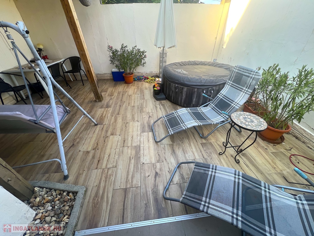 - A ház előtt található 26 m2 alapterületű két terasz, amiből az egyik járólappal burkolt.