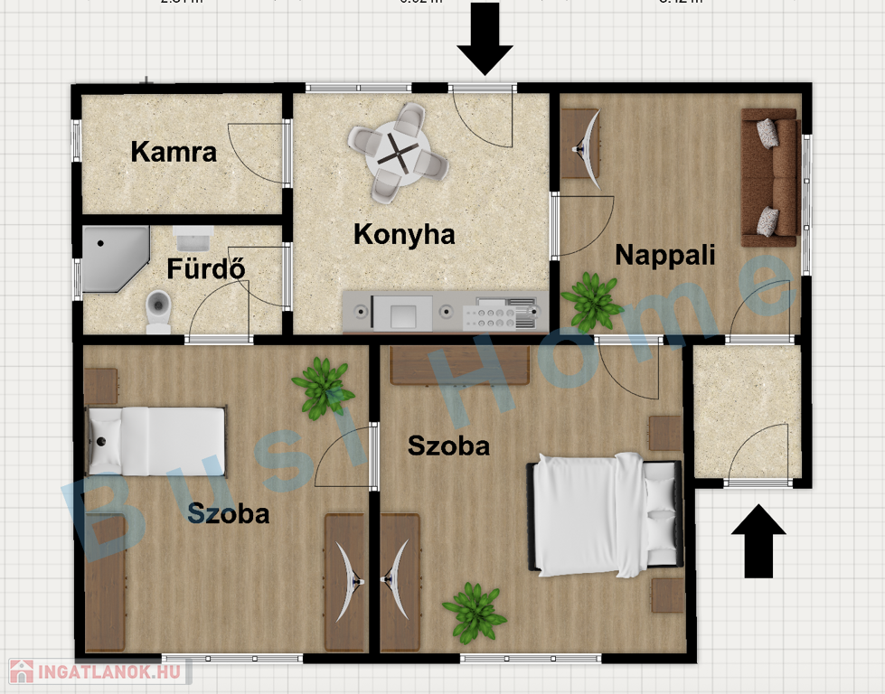 - 2 bejárattal rendelkezik, egyik az utcafront felől, másik a hátsó udvar felé, ahová egy kényelmes terasz építhető